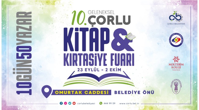 Çorlu Belediyesi, Çorlu Ticaret ve Sanayi Odası, Mektebim Koleji ile Çorlu Esnaf ve Sanatkârlar Odası iş birliğiyle düzenlenen "Geleneksel Çorlu Kitap ve Kırtasiye Fuarı"nda 10 günde ülkemizin değerli 50 yazarı Çorlulu kitapseverlerle buluşacak. Okulların açılmasıyla birlikte öğrencilerin kırtasiye ihtiyaçlarını uygun fiyatlarla alabilmelerine olanak sağlayabilmek için kırtasiye firmaları da fuarda yer alacak.