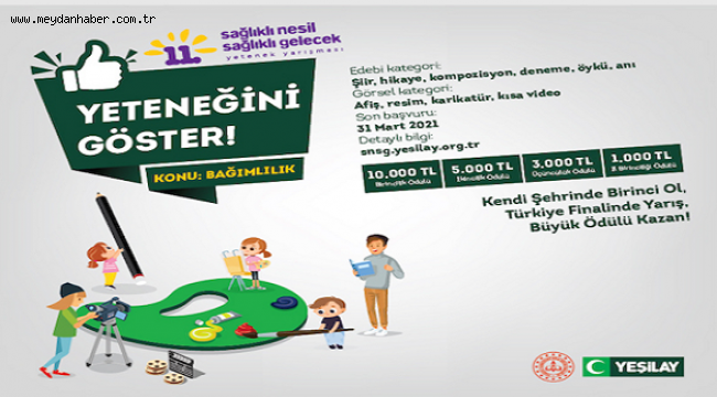 Yeşilay’ın genç nesillerde bağımlılıklara ilişkin farkındalık oluşturmak ve onları yeteneklerini keşfetmeye teşvik etmek amacıyla düzenlediği Sağlıklı Nesil Sağlıklı Gelecek Yetenek Yarışması’nın 11’incisi için başvurular başladı. Milli Eğitim Bakanlığı (MEB) iş birliğiyle düzenlenen yarışmaya; ilkokul, ortaokul ve lise öğrencileri edebi ve görsel olmak üzere iki ayrı kategorideki eserleriylekatılabiliyor. Edebi kategoride kompozisyon, şiir, öykü, deneme ve anı;görsel kategoride afiş, resim, karikatür ve kısa video alanlarında üretilmiş bağımlılık konulu eserler yarışıyor.