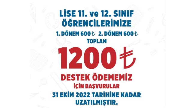 11 VE 12'İNCİ SINIF ÖĞRENCİLERİNE YILLIK 1200 TL DESTEK BAŞVURUSUNUN TARİHİ UZATILDI