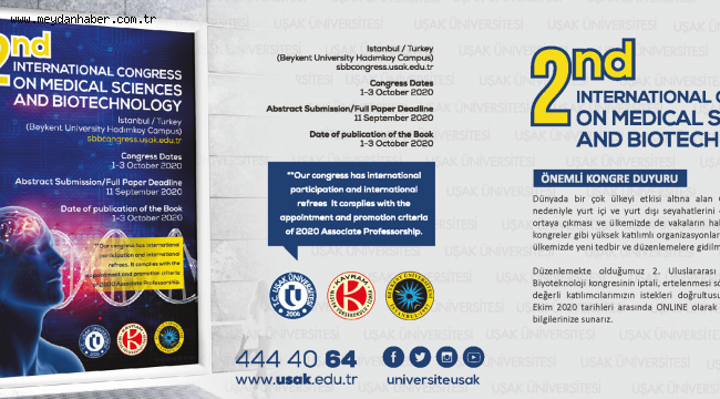 Uşak Üniversitesi ev sahipliğinde, Beykent Üniversitesi ve İzmir Kavram Meslek Yüksekokulu işbirliğinde ikincisi gerçekleştirilecek olan “Uluslararası Sağlık Bilimleri ve Biyoteknoloji” kongresi (2nd International Congress on Medical Sciences and Biotechnology) 1-3 Ekim 2020 tarihleri arasında gerçekleştirilecek.