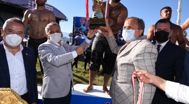 Vali Ersin Yazıcı, müsabakalarda birinci olarak altın madalya kazanan ve Kumluca Güreşleri