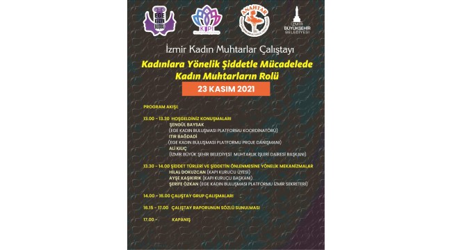 “Şiddetle Mücadelede Kadın Muhtarların Rolü” konulu toplantımız 23 Kasım 2021 tarihinde 13:00-17:00 saatleri arasında İzmir Büyükşehir Belediyesi ANAHTAR Kadın Çalışmaları Bütüncül Hizmet Merkezi’nde gerçekleştirilecektir.