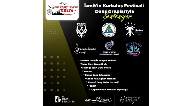 İzmit Belediyesinin kurtuluşun 100.yılına özel olarak hazırladığı bir haftalık kutlama etkinliklerinde sanata geniş yer verildi. Sanata ve sanatçıya gösterdiği ilgiyle, verdiği destekle adından sıkça söz ettiren İzmit Belediye Başkanı Av. Fatma Kaplan Hürriyet, kutlamalarda dans okullarına ve halk oyunları ekiplerine de yer verdi. İzmitli dans ve halk oyunları ekiplerinin yanı sıra farklı şehirlerden konuk ekipleri de kutlamalara dahil ederek programı zenginleştirdi.