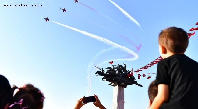 Saat 15.45'de Süvari Birlikleri'nin Cumhuriyet Meydanı'ndan Gündoğdu Meydanı'na yürüyüşünün ardından İzmir semaları, saat 16.15'den itibaren, önce Genel Havacılık Uçakları ve İzmir Kulüpleri selamlama uçuşuna sahne olacak. Ardından Hürkuş Gösteri uçuşu, Solo Türk, Türk Yıldızları, Jandarma Çelik Kanatlar gösterisi, Polis Havacılık Üzüm Salkımı, Sahil Güvenlik Arama Kurtarma ve selamlama ile Çelik Kanatlar Zeybek nefes kesen gösteriler yapacak.
