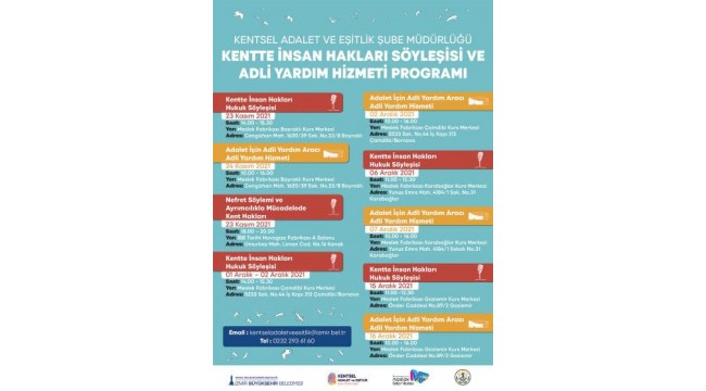 6 Aralık-7 Aralık tarihlerinde 11.00’de Meslek Fabrikası Karabağlar Kurs Merkezi’nde “Kentte İnsan Hakları” söyleşisi var. 10.00-16.00 saatleri arasında ise adli yardım hizmeti olacak.
