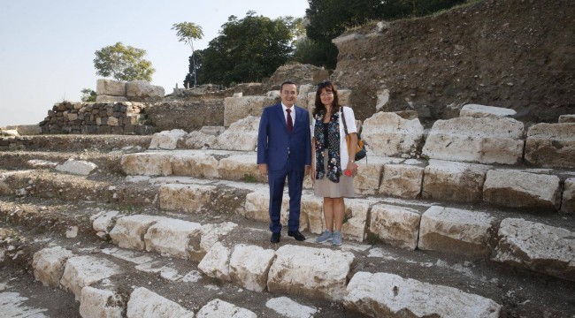 Başkan Batur, Yunanistan Başkonsolosu Argyro Papoulia ile birlikte Kadifekale’nin eteklerinde bulunan Smyrna Antik Tiyatrosu Kazı Alanı’nı ziyaret etti. Smyrna Antik Kenti Kazı Başkanı, Dokuz Eylül Üniversitesi (DEÜ) Arkeoloji Bölümü Öğretim Üyesi Doç. Dr. Akın Ersoy’un rehberliğinde kazı alanını gezen Başkan Batur, Smyrna Antik Tiyatrosu’nun, Konak ilçe sınırları içinde bulunan, tarihi misyonu önemli noktalardan biri olduğuna dikkat çekti. Başta Kültür ve Turizm Bakanlığı ile İzmir Büyükşehir Belediyesi olmak üzere hem geçmiş dönemde hem de bugün alanda yapılan çalışmalara katkı koyan tüm kurumlara teşekkür eden Batur, “Kazı Başkanı Akın Ersoy ve ekibine de çok teşekkür ederiz. Şehrin kalbine kurulu bu dev tiyatro alanı onların sihirli elleriyle ortaya çıkacak. Turizmde rotaları değiştirecek, İzmir’i dünyaya açacak büyük bir çalışma yapılıyor. Kuşkusuz dünyanın dört bir yanından binlerce insan tiyatroyu görmeye gelecek. İzmir ve Konak, turizmin yeni cazibe merkezi haline gelecek. Bugünü ve bu heyecanımızı bizimle paylaşan Başkonsolos Papoulia’ya da teşekkür ediyoruz” diye konuştu.