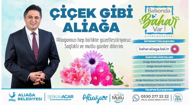 Aliağa Belediyesi’nin başlattığı “Balkonda Bahar Var” projesi kapsamında çiçek isteyen Aliağalılar Belediyenin internet sitesinden başvuru formunu dolduracak. Projeye Belediye internet sitesinden ve https://bahar.aliaga.bel.tr adresinden başvurulacak.