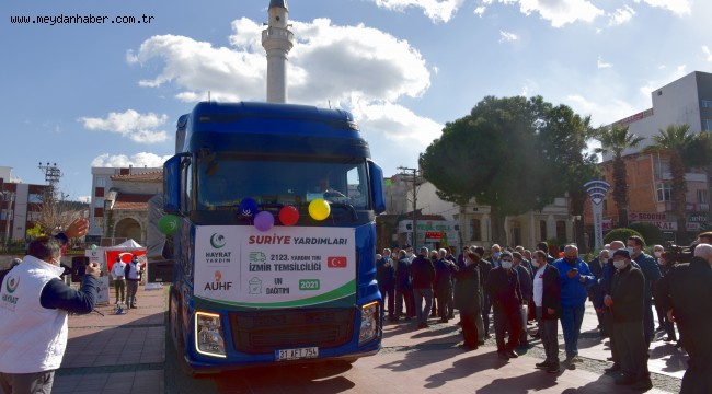 Un ve gıda malzemeleri ile yüklü olan tırlar, Aliağa Demokrasi Meydanı’nda Cuma namazı sonrası gerçekleştirilen törenin ardından dualar eşliğinde Suriye'ye uğurlandı. Gerçekleştirilen törene Aliağa Kaymakamı Ömer Karaman, Aliağa Belediye Başkanı Serkan Acar, İlçe Jandarma Komutanı Rıfkı Kulaksız, İlçe Emniyet Müdürü Mehmet Balıkçıoğlu, daire amirleri, Hayrat İnsani Yardım Derneği İzmir Kuzey Bölge Koordinatörü Ali Mamak ile vatandaşlar katıldı.