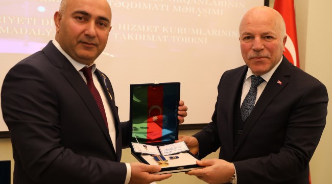 Azerbaycan Cumhurbaşkanı İlham Aliyev, Erzurum Büyükşehir Belediye Başkanı Mehmet Sekmen’i onur madalyasıyla ödüllendirdi. Azerbaycan Kars Başkonsolosluğu’nda düzenlenen törende konuşan Büyükşehir Belediye Başkanı Mehmet Sekmen, “Biz iki ayrı devlet olabiliriz ama özümüzde tek milletiz ve gardaşız” ifadesini kullandı. Azerbaycan Cumhuriyeti’nin Diplomatik Hizmet Kurumlarının Kuruluşunun 100’üncü yılı münasebetiyle Onur Madalyası takdim töreni düzenlendi. Azerbaycan Kars Başkonsolosluğu’nda düzenlenen törene Kars Valisi Türker Öksüz’ün yanı sıra şehir protokolünün neredeyse tamamı katılırken, programın davetlileri arasında Azerbaycan Cumhurbaşkanlığı Onur Madalyasına layık görülen Erzurum Büyükşehir Belediye Başkanı Mehmet Sekmen de vardı.