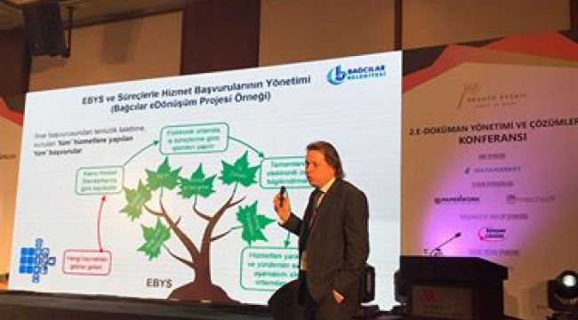 Türkiye’nin önde gelen firmalarının bilişim yöneticilerininbuluştuğu “2. E-Doküman Yönetimi ve Çözümleri” konferansı İstanbul’da gerçekleştirildi. Bağcılar Belediyesi adına sunum yapanBilgi İşlem Müdürü Cüneyt Yılmaz, e-devlet kapısı üzerinden yapılan hizmetleri anlattı. Yılmaz, “Elimizden giden bu zamanıailemize, kendimize ya da sevdiklerimize ayırmak varken bir kurumda saatlerce vakit harcamayı hiçbirimiz istemeyiz. E-belediye hizmetleri ile vatandaşlarımıza sağladığımız en önemli hizmet aslında bu zamanlarını onlara yeniden hediye etmek” dedi.
