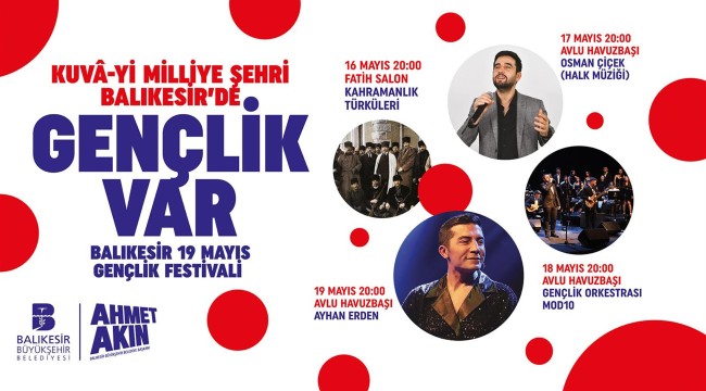 Büyükşehir Belediye Başkanı Ahmet Akın, ‘Balıkesir’de Gençlik Var’ sloganıyla 19 Mayıs Atatürk’ü Anma, Gençlik ve Spor Bayramı onuruna ‘Gençlik Festivali’ düzenliyor. 16-19 Mayıs günleri arasında devam edecek olan festivalin içeriği oldukça zengin. Dört gün boyunca sürecek olan festival, birbirinden eğlenceli organizasyonlara ev sahipliği yapacak. Gençlik Festivali etkinlikleri kapsamında; Avlu’da konserler, Milli Kuvvetler Caddesi’nde de konser, atölye ve etkinlikler yer alacak.