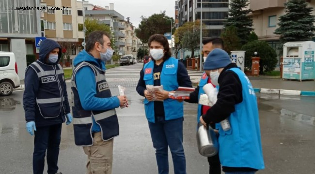 Öğrenciler sabahın erken saatlerinden itibaren Balıkesir'in önemli noktalarında uygulama yapan polis ekiplerine, yol çalışmaları ve temizlik faaliyetlerini sürdüren belediye çalışanların yanlarında olduklarını hissettirmek için onlara sıcak çay , taze simit ve peynir ikramında bulundular.