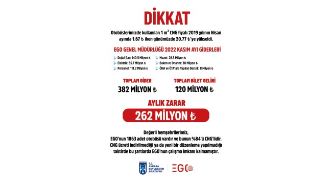 Bu durum sürdürülebilir değildir. Her ay oluşan bu devasa zarar yine Ankara halkının parasıyla kapatılmaktadır. EGO, 1863 adet otobüsle hizmet vermektedir ve bunun yüzde 84’ü CNG’lidir. CNG fiyatı indirilmediği ya da vergilerle ilgili yeni bir düzenleme gelmediği takdirde biniş ücretlerinde fiyat artışı kaçınılmaz olacaktır.