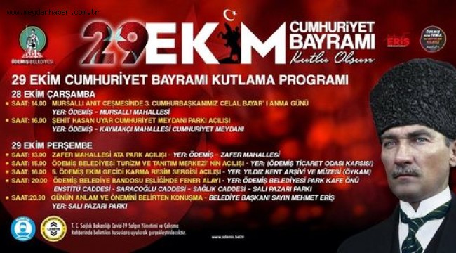 Büyük Önder Gazi Mustafa Kemal Atatürk’ün 10. Yıl Nutku’nda “En büyük bayram” olarak nitelediği 29 Ekim Cumhuriyet Bayramı’nda Ödemiş’te resmi kutlama programı 28 Ekim Çarşamba günü 13.00’da Hükümet Meydanı’ndaki anıta Ödemiş Kaymakamlığı ve Ödemiş Belediye Başkanlığı çelenklerinin sunulmasıyla başlayacak.