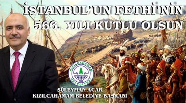 Kızılcahamam Belediye Başkanı Süleyman Acar; Tarih boyunca üç büyük imparatorluğa başkentlik yapmış olan tarih ve kültür şehri İstanbul’un, Fatih Sultan Mehmed Han Hazretleri tarafından 29 Mayıs 1453 tarihinde fethedilişinin 566. Yıl dönümüne erişmiş bulunmaktayız” diyerek kutlama mesajı yayınladı.
