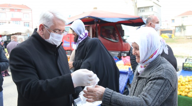Başkan Yüksel Pazarda Dezenfektan, Maske ve Eldiven Dağıttı