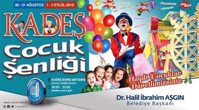 7'den 70'e herkesime hitap eden ve kültürel çalışmaları ile bir birinden güzel etkinlikleri Çorumlular ile buluşturan belediye şimdide çocuklar için 4 gün sürecek şenlik düzenliyor. Kadeş Çocuk Şenliği adı altında düzenlenecek etkinlik 30 Ağustos ile 2 Eylül tarihleri arasında saat: 18.00 ile 21.00'da Kadeş Barış Meydanında gerçekleşecek. Etkinlik hakkında açıklama yapan Belediye Başkanı Dr. Halil İbrahim Aşgın, çocuklarımızın bizim her şeyimiz yaz tatilinin son günlerinde onları okula motive etmek için Kadeş Çocuk Şenliğini düzenliyoruz şenliğimizde pamuk şeker, jonglör, kukla, illüzyon, animasyon gösterilerinin yanı sıra balon katlama, oyun parkı, ebru atölyesi, origami atölyesi ve uçurtma atölyesiyle minik dostlarımız doyasıya eğlenecek. Aşgın, birbirinden güzel etkinliklerin yer alacağı çocuk şenliğine tüm çocukları davet ediyorum dedi.