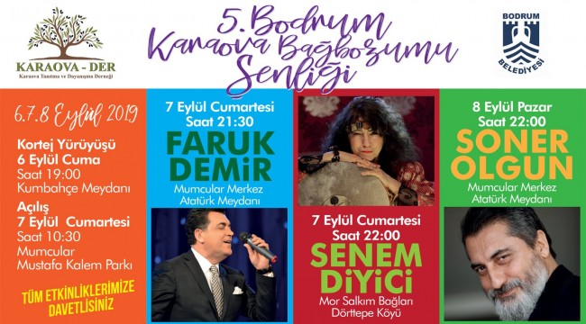 Karaova Bağbozumu Şenliği, 6-7 ve 8 Eylül tarihlerinde gündüz ve gece etkinlikleriyle Bodrum’a ayrı bir coşku yaşatacak. Unutulmaya yüz tutan lezzetlerin ve yöresel yemeklerin tadılacağı şenlikte, yemek yarışmaları, konserler düzenlenirken, Karaova bağlarında ise şenlik ateşleri yakılacak. Bağbozumu şenliğinin açılış günündeki ilk konser Mumcular Atatürk Meydanı’nda Karaova Halk Korosu tarafından verilecek. Meydanı dolduranlar koronun ardından aynı zamanda Kars Ardahan Belediye Başkanı olan Faruk Demir’in türkülerine eşlik edecek. Bodrum Belediyesi’nin katkılarıyla düzenlenecek olan konserlerde sahne alacak olan Faruk Demir bu konserden elde edeceği geliri Ardahanlı öğrencilere burs olarak aktaracak.