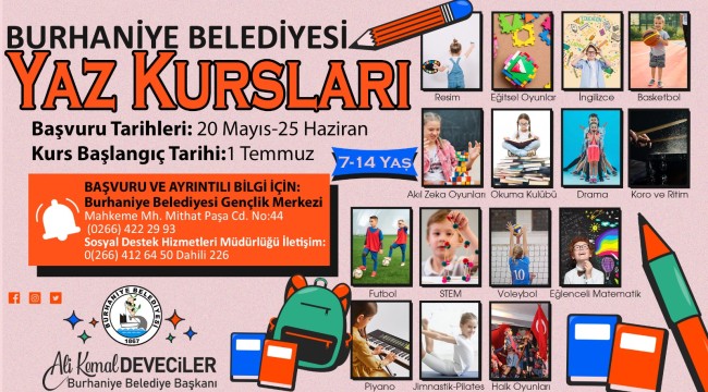 tatillerini eğlenirken öğrenerek geçirecek. Detaylı bilgi için öğrenci ve veliler Burhaniye Belediyesi Sosyal Destek Hizmetleri Müdürlüğü’ne bağlı Gençlik Merkezi’ne giderek ya da telefon ile iletişim kurarak bilgi alabilecek, 1 aylık başvuru sürecinde kimlik fotokopileri ve