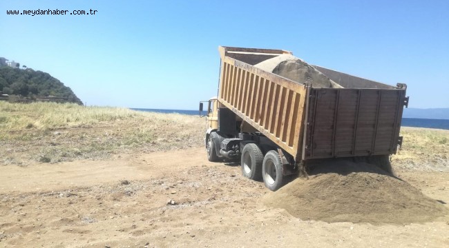 yapılan hendek çalışması sonrası plajlarda fazlalık kumların taşıma ve serme işlemleri