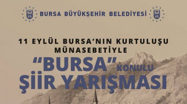 Büyükşehir Belediyesi’nin 11 Eylül Bursa’nın kurtuluşu münasebetiyle düzenlediği ‘Bursa’ konulu şiir yarışmasında ilk başvurular, 11 Eylül 2020 tarihinde alınıyor. 18 yaşını dolduran herkesin 6 Nisan 2021 tarihine kadar katılabileceği yarışmada sonuçlar, 11 Eylül 2021 tarihinde açıklanacak. Dereceye giren eser sahiplerine para ödülü verilecek.
