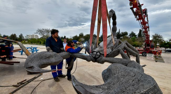Antalya’da Muratpaşa Belediyesi, kentin takımı Antalyaspor’un simgesi olan akrebi, sadece demir ve sacdan oluşan dev bir heykele dönüştürdü. 4 metre uzunluğa, 3 metre 20 santimetre genişlik ve 2 metre yüksekliği bulunan heykel, 4 aylık bir çalışmanın sonunda ortaya çıktı. 7 metre uzunluk ve 2 metre yüksekliğinde futbol topu formunda kaidesi bulunan heykel dün gün boyu süren çalışmalarla Antalyaspor’un evi Antalya Stadyumu’nun önüne yerleştirdi.