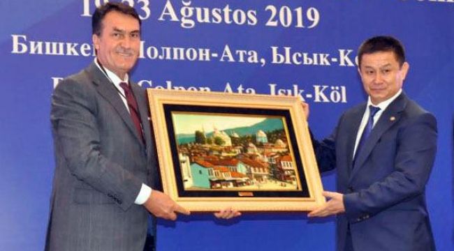 Başkan Dündar konuşmasının ardından Kırgızistan Cumhuriyeti Cumhurbaşkanı Genel Sekreteri Urmattuu Dosali Esenaliyev’e Bursa ipeği üzerine işlenmiş Bursa tablosu hediye etti.