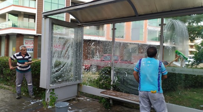 Bergama Belediyesi Koronovirüsle mücadele etmeye başladığı ilk günden bu yana ilçenin en aktif noktalarını rutin olarak temizleyip dezenfekte ediyor. Normalleşme sürecinde rehavete kapılmadan temizlik ve dezenfekte çalışmalarını sürdüren ekipler ilçede bulunan tüm otobüs duraklarını yıkayıp, temizleyerek dezenfekte işlemlerinden geçirmeye devam ediyor. Otobüs duraklarında vatandaşın temas ettiği yerler, camlar ve bekleme alanı en ince ayrıntısına kadar yıkanıyor ve daha sonra dezenfekte faaliyetinden geçiriliyor. Bu işlemler uygulanırken duraklardaki ve çevresindeki yoğunluğa azami ölçüde dikkat ediliyor.