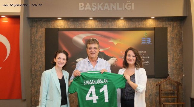 Ödülü İzmit Belediye Başkanı Av. Fatma Kaplan Hürriyet adına Kadın ve Aile Hizmetleri Müdürü Sinem Gülenç, Edremit Belediyesi Özel Kalem Müdürü Tayfun Canlı’nın elinden aldı. 4. Edremit Kitap Fuarı’nı da gezen İzmit Belediyesi müdürleri; Ceren Öker Cömert ve Sinem Gülenç, Edremit Belediye Başkanı Selman Hasan Arslan’ı da makamında ziyaret etti. Arslan’a 41 numaralı Kocaelispor forması hediye eden Cömert ile Gülenç, başkan Hürriyet’in selamlarını iletti.