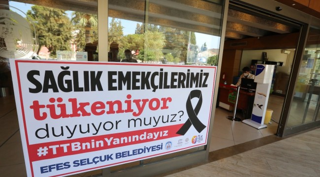 Efes Selçuk Belediyesi çalışanları sosyal medyada #İyikiTTBvar #TTBninyanındayız etiketleriyle Türk Tabipler Birliği’ne verilen desteğe yakalarına taktıkları kokartlarla katıldılar. Efes Selçuk Belediye Hizmet Binası girişine ise “Sağlık Emekçileri Tükeniyor. Duyuyor musunuz?” yazan bir pankart asıldı. Belediyenin sağlık çalışanları ile ilgili hazırlamış oldukları kokartlar sağlık ocağı ve hastanelere de dağıtıldı.