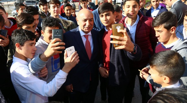 öğrencilerle bir araya Başkan Altınok okul girişinde kalabalık bir öğrenci topluluğu tarafından alkış ve