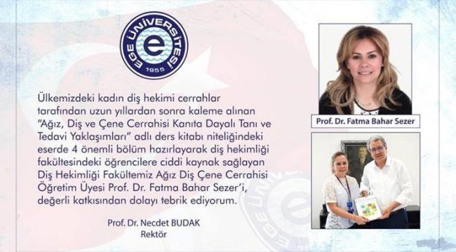 Ege Üniversitesi Diş Hekimliği Fakültesi Ağız Diş Çene Cerrahisi Öğretim Üyesi Prof. Dr. Fatma Bahar Sezer, Türkiye’de kadın diş hekimi cerrahları tarafından kaleme alınan “Ağız, Diş ve Çene Cerrahisi Kanıta Dayalı Tanı ve Tedavi Yaklaşımları” adlı ders kitabına bölüm hazırladı. Ege Üniversitesi Rektörü Prof. Dr. Necdet Budak, Prof. Dr. Sezer’i başarısından dolayı tebrik etti. Prof. Dr. Budak, “Ülkemizdeki kadın diş hekimi cerrahlar tarafından uzun yıllardan sonra kaleme alınan ‘Ağız, Diş ve Çene Cerrahisi Kanıta Dayalı Tanı ve Tedavi Yaklaşımları’ adlı ders kitabı niteliğindeki eserde 4 önemli bölüm hazırlayarak diş hekimliği fakültelerindeki öğrencilere ciddi kaynak sağlayan Prof. Dr. Fatma Bahar Sezer’i değerli katkısından dolayı tebrik ediyorum” dedi.