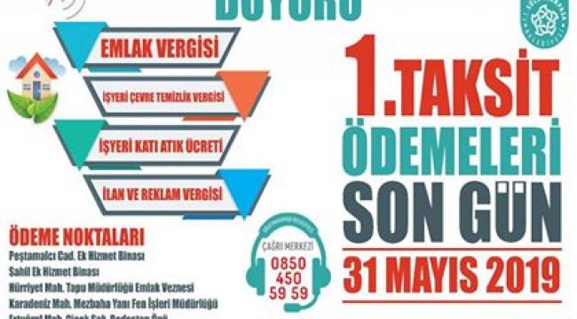 2019 yılı Emlak, işyerlerine ait Çevre Temizlik ve Katı Atık ile İlan ve Reklam Vergilerinin 1. taksitinin son ödeme tarihi 31 Mayıs 2019 Cuma günü olarak açıklandı.