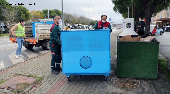 Menteşe Belediyesi ekipleri eskiyen ve yıpranan geri dönüşüm sepetlerini, yeni modern atık konteynırları ile değiştiriyor.
