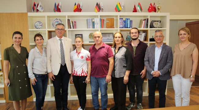 Gençlerin spor yapmasının önemine her fırsatta dikkat çeken ve bu alanda çalışmalara katkı koyan Gaziemir Belediye Başkanı Halil Arda da, Nazlı Savranbaşı’nı büyük başarısının ardından makamında ağırlayarak kendisine ata altını armağan etti.