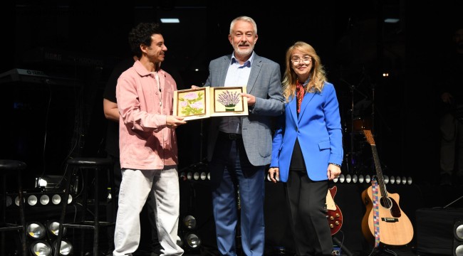 ağızdan eşlik etti. Sanatçı Buray sahnede Isparta gülleriyle karşılandı.