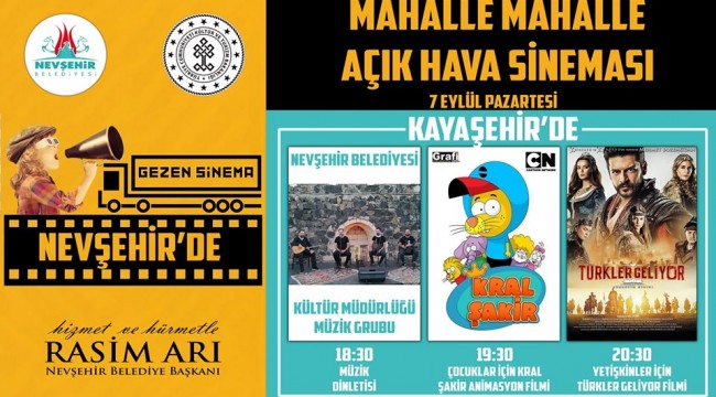 Nevşehir Belediyesi’nin ev sahipliğinde Nevşehir’de mahalleleri gezen ve Kültür ve Turizm Bakanlığı, Milli Eğitim Bakanlığı ve Sanat İçin Yola Çık Kültür ve Sanat Derneği'nin ortak projesi olan "Gezen Sinema Tır'ı bu akşam Kayaşehir’de olacak.