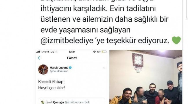 Başkan Hürriyet’in ardından ünlü sanatçı Haluk Levent’in kurucusu olduğu ve ihtiyaç sahiplerine yardım etmek için mücadele eden AHBAP’ın Kocaeli temsilcileri Nermin Teyze ve oğullarını ziyaret etti. Evin yeni halini oldukça beğenen Haluk Levent’in ekibi sosyal medya üzerinden “Ailemizin gıda ve eşya ihtiyacını karşıladık. Evin tadilatını üstlenen ve ailemizin daha sağlık bir evde yaşamasını sağlayan İzmit Belediyesi’ne teşekkür” ederiz mesajı yayınladı. Bunun üzerinde Haluk Levent’te bu yazıyı kendi sosyal medya hesabında paylaşarak İzmit Belediyesi’ne teşekkürlerini iletti.