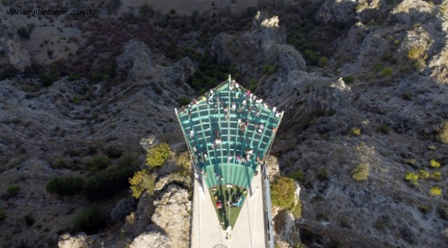 Uşak'taki Ulubey Kanyonu'nda bulunan cam terastan iki dağcı iple iniş yaptı.