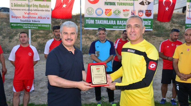 Bağbaşı Semt Sahasında oynanan maçtan önce, Neşet Ertaş Masterlar Derneği tarafından organize edilen turnuva için çeşitli illerden gelen takımların kaptanları ve teknik sorumlularına katılımlarından dolayı plaket veren Valimiz Sayın İbrahim Akın, tüm takımlara başarılar dileyerek turnuvayı düzenleyenlere teşekkür etti.