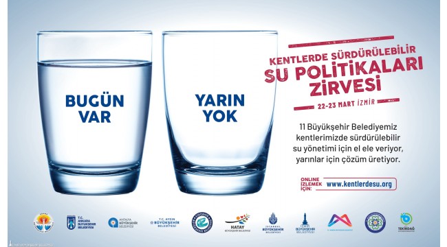 İzmir Büyükşehir Belediyesi, 22 - 23 Mart tarihlerinde “Kentlerde Sürdürülebilir Su Politikaları Zirvesi’ne ev sahipliği yapacak. Zirvede İzmir, İstanbul, Ankara, Adana, Antalya, Aydın, Eskişehir, Hatay, Mersin, Muğla ve Tekirdağ Büyükşehir Belediye Başkanları, Türkiye’nin suyla ilgili sorunlarını ve çözümlerini tartışmak, su yönetimi ile ilgili en iyi uygulamaları ve politikaları görüşmek amacıyla bir araya gelecek.