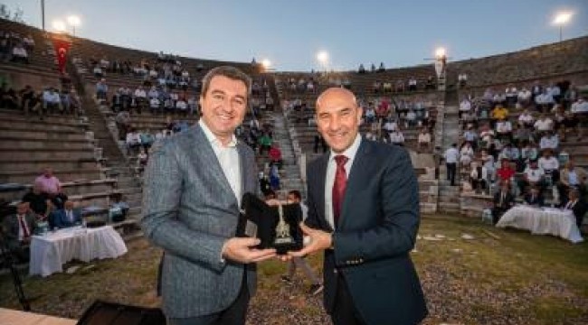 UNESCO Dünya Mirası Listesi’ndeki kentler arasında yer alan tarihi zenginlikleriyle ünlü Bergama, ilk kez bir Büyükşehir Belediye Meclisi toplantısına sahne oldu. İlçenin tarihi ve kültürel değerlerinin dünyaya tanıtılmasını hedefleyen Başkan Tunç Soyer’in teklifi üzerine, Meclis’in Ağustos ayı ikinci birleşimi geçmişi 2 bin 400 yıl öncesine dayanan Asklepion Tiyatrosu’nda yapıldı. İzmir Büyükşehir Belediye Meclisi 1800’lü yıllarda parçaları Almanya’ya kaçırılan Zeus Sunağı’nın anavatanı Bergama’ya geri getirilmesi için çalışma başlatma kararı aldı.
