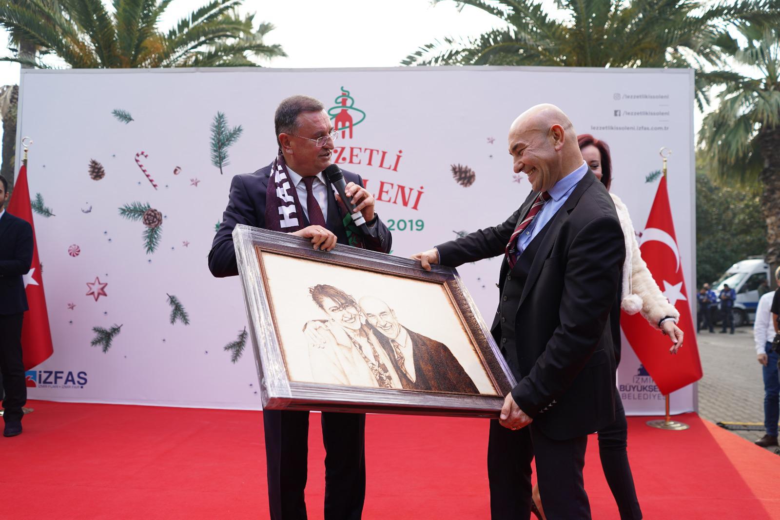 Lezzetli Kış Şöleni’nin açılışında Hatay Büyükşehir Belediye Başkanı Doç. Dr. Lütfü Savaş, ev sahibi İzmir’in başkanı Tunç Soyer’e eşi Neptün Soyer ile birlikte yer aldığı yakma resim tablosunu ve Hatayspor atkısını hediye etti.