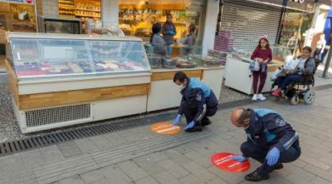 İzmir'de sosyal mesafe için zemin çıkartmaları devrede