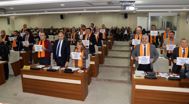 Karabağlar Belediye Meclisi’nin aralık ayı ilk oturumunda, mecliste grubu bulunan siyasi partilerin temsilcileri kadına yönelik şiddeti protesto etti. 25 Kasım’ın Kadına Yönelik Şiddete Karşı Uluslararası Mücadele Günü olması nedeniyle boyunlarına turuncu renk atkı takan meclis üyeleri, ellerinde de “Kadına her türlü şiddete hayır” içerikli döviz taşıdılar.