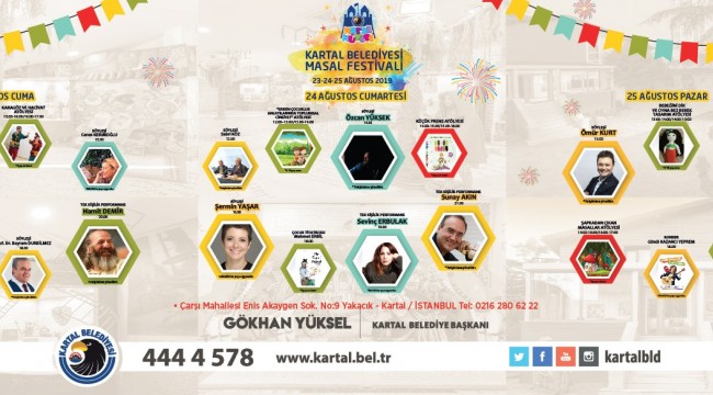 Kartal Belediye Başkanı Gökhan Yüksel’in öncülüğünde, 23-24-25 Ağustos 2019 tarihinde düzenlenecek olan festivalde; birçok sanatçı, yazar ve eğitimcinin katılımı ile atölye çalışmaları, söyleşiler, konserler, tek kişilik performanslar ve animasyon gösterileri yer alacak. Kartal Belediyesi Masal Müzesi’nde Kartallı çocuk ve yetişkinler için 3 gün boyunca devam edecek olan festivalin açılışı, 23 Ağustos Cuma günü saat 17.00’da Kartal Belediye Başkanı Gökhan Yüksel ve şair-yazar Sunay Akın’ın katılımı ile yapılacak.