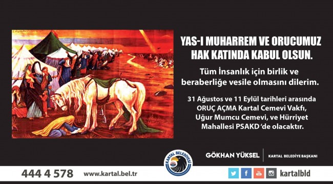 Kartallılar, her yıl olduğu gibi bu yıl da Kartal Belediyesi, Kartal Cemevi Vakfı, Uğur Mumcu Cemevi ve Hürriyet Mahallesi Pir Sultan Abdal Kültür Derneği (PSAKD) işbirliği ile kurulacak olan Muharrem orucu sofralarında bir araya gelecek. 31Ağustos–11 Eylül 2019 tarihleri arasında Muharrem orucu tutacak vatandaşlar için 12 gün boyunca Kartal Cemevi Vakfı, Uğur Mumcu Cemevi ile Hürriyet Mahallesi Pir Sultan Abdal Kültür Derneği’ndeoruç açma yemeği verilecek.
