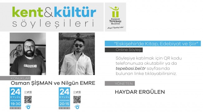 Koronavirüs dolayısıyla online olarak gerçekleştirilecek söyleşinin bu ayki konukları Osman Şişman ve Nilgün Emre olacak. Koordinatörlüğünü Haydar Ergülen’in yaptığı söyleşi 24 Eylül tarihinde iki oturum halinde gerçekleşecek. “Eskişehir’de Kitap, Edebiyat ve Şiir” isimli söyleşide 19.30’da Osman Şişman, 20.15’te ise Nilgün Emre edebiyatseverler ile buluşacak. Programa katılmak isteyenler, etkinliğin QR kodunu telefonlarına okutarak söyleşiyi dinleyebilecek. Ayrıca www.tepebasi.bel.tr web adresinden duyurulacak link ile de söyleşiye ulaşılabilecek.