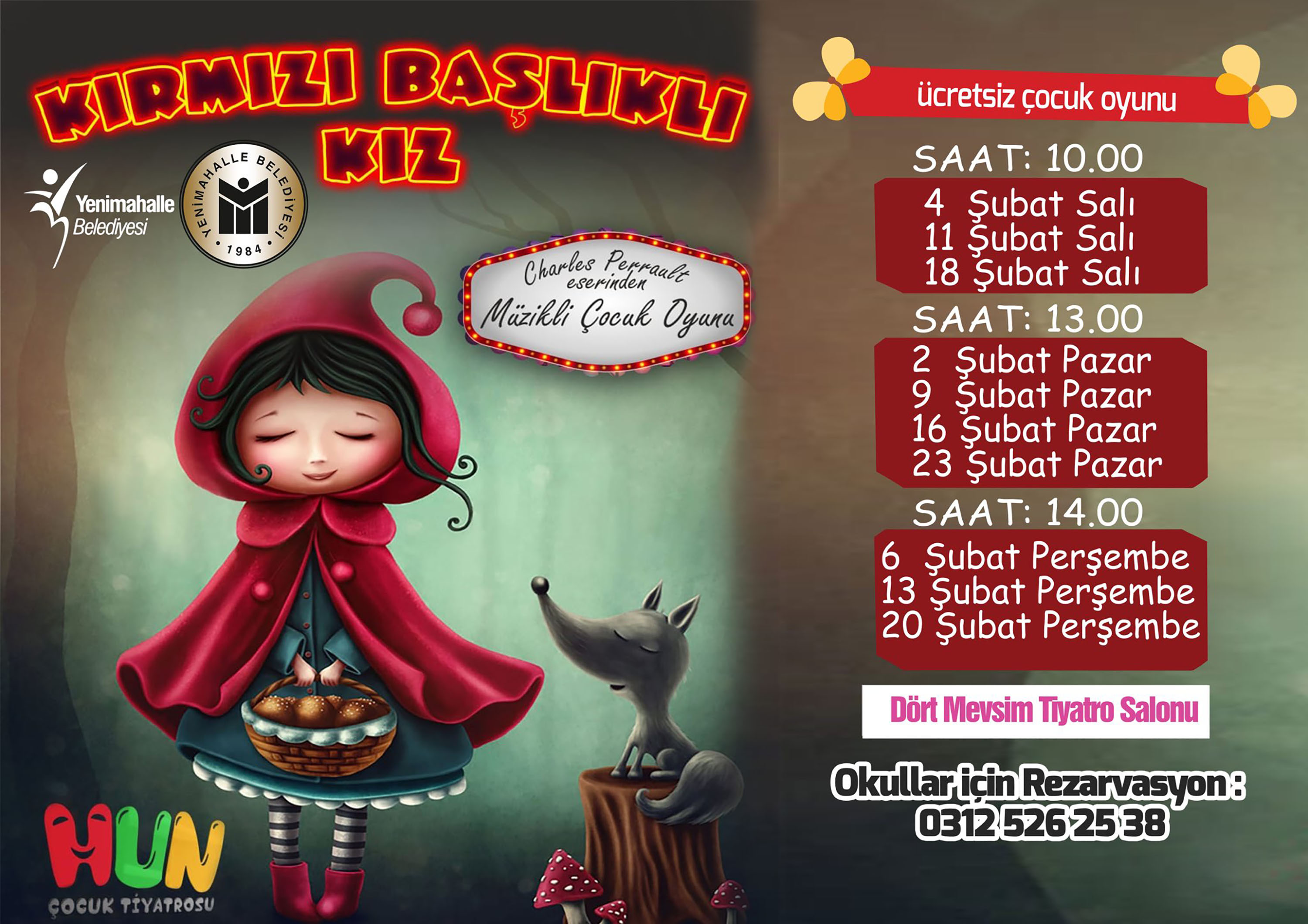 Çocuklara iyilik, sevgi ve hoşgörü aşılamak amacıyla belediye sahnelerini hiç boş bırakmayan Yenimahalle Belediyesi, Charles Perrault’un eserinden uyarlanan Kırmızı Başlıklı Kız'ı tiyatro sever miniklerin ayaklarına getiriyor. Nesilden nesile aktarılan ve yediden yetmişe herkesin sevdiği masalın, müzikli çocuk oyunu Şubat ayı boyunca Dört Mevsim Tiyatro Salonu’nda ücretsiz olarak sahnelenecek.