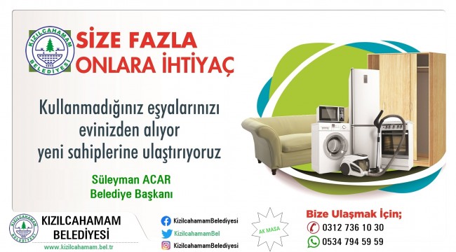 Kullanılmayan eşyalarını ihtiyaç sahiplerine ulaştırmak isteyen vatandaşların Kızılcahamam Belediyesi’nin 0312 736 10 30 veya Watsap Destek Hattı 0534 794 59 59 numaralı hattını Mesaj atarak gerekli bilgiyi vermeleri yeterli olacak. Belediye ekipleri yardımları adresten alırken, eşya giriş ve çıkışı, kimlere ne kadar eşyanın dağıtıldığı da düzenli olarak kayıt altına alınıyor.